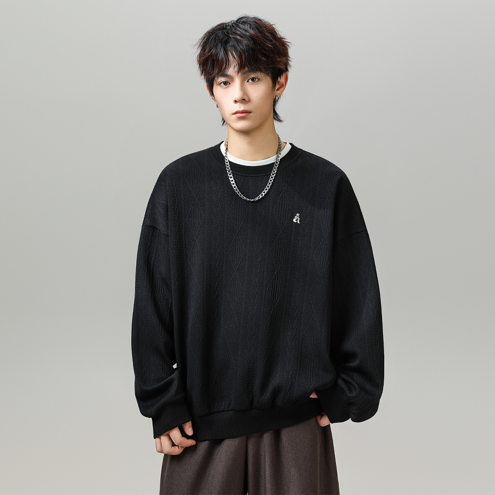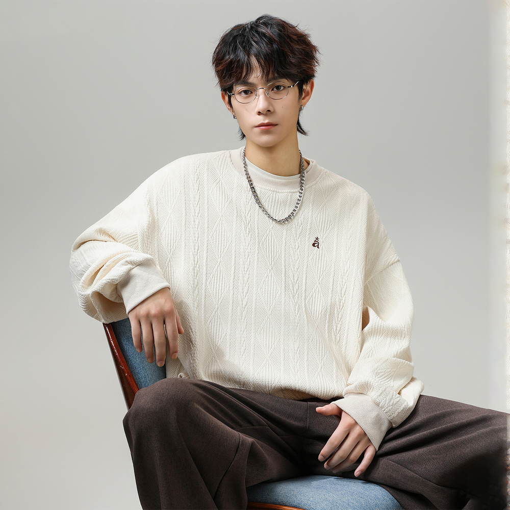 This heavyweight color-block crewneck with jacquard texture and vintage embroidered lettering lends Old-Money edge to fall wardrobes. Machine wash cold, inside out; lay flat to dry and avoid bleach. Pair with denim or wool trousers for elevated casual style.